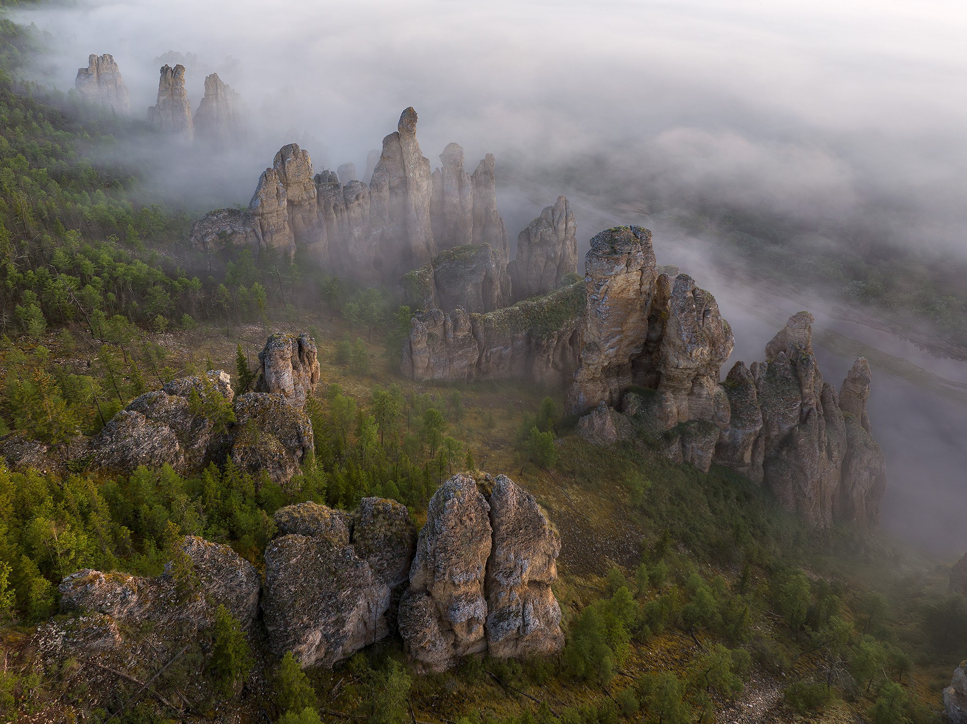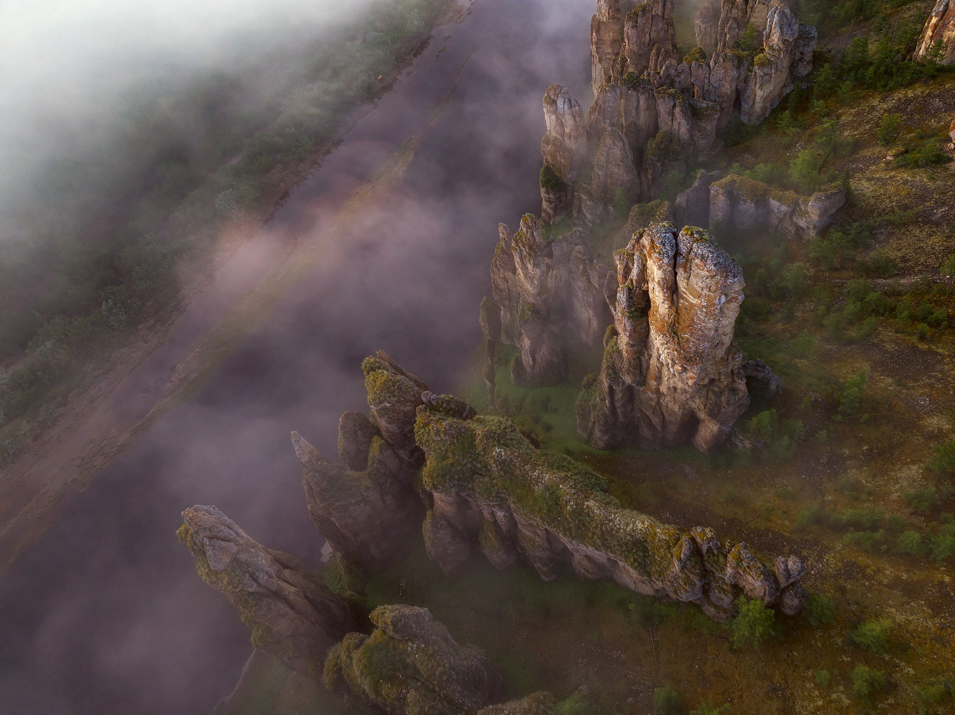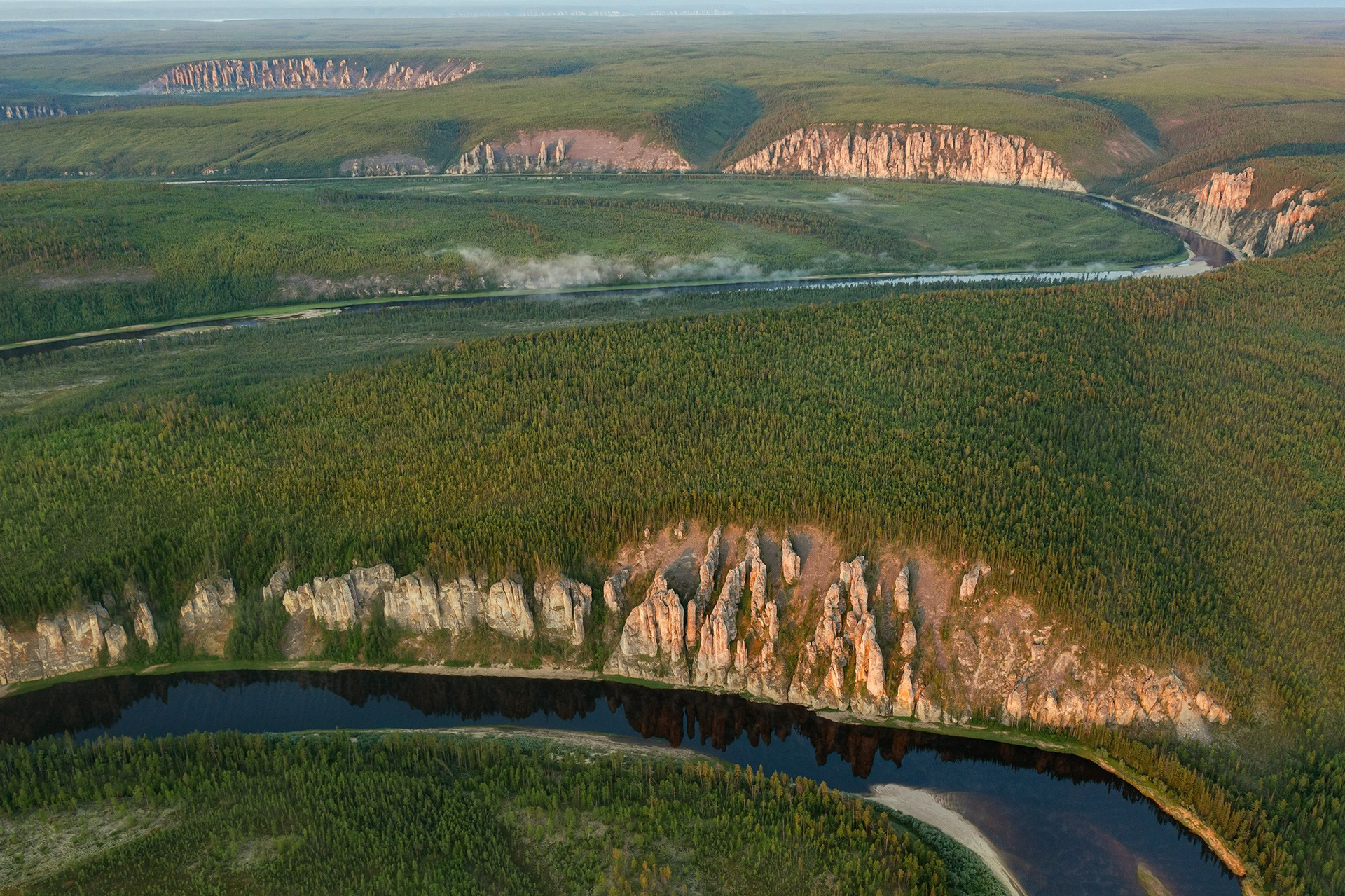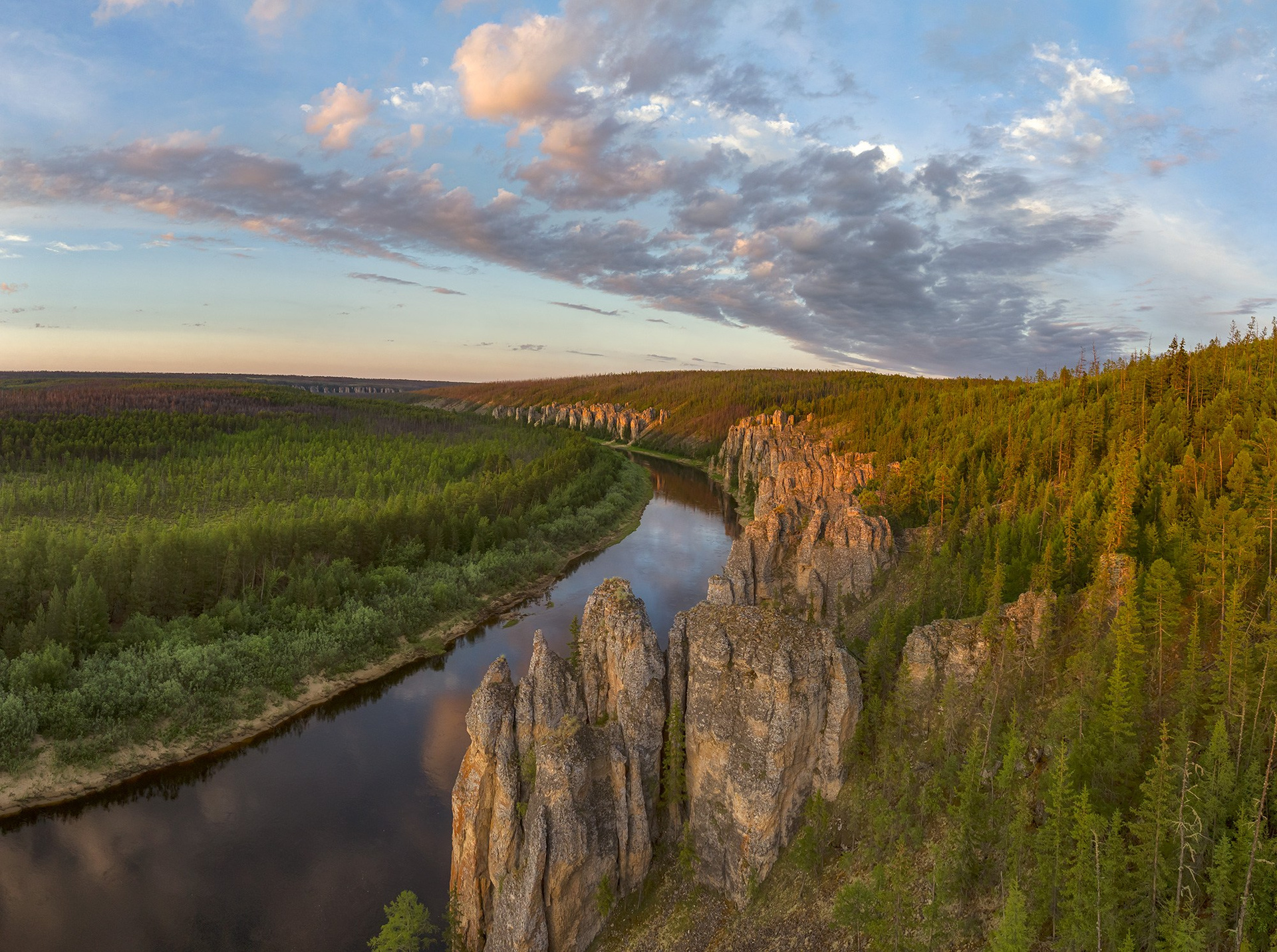 От места, где начинается сплав по реке Сиинэ, до устья придётся пройти 127 километров. Люди считали, и говорят, что здесь 37 групп скал, то есть останцовых комплексов, которые можно как-то отделить друг от друга. В некоторых местах, скальные комплексы встают один за другим, меняясь на поворотах реки. Обычно один берег скальный, а противоположный пологий. Останцы сложены карбонатными породами, известняками Приленского плато, такими же, как и в Ленских столбах. А значит, когда-то здесь было море, осадки накопились на дне этого моря мощными отложениями. Но потом тектонические движения подняли эти уже окаменевшие отложения наверх, сделали сушей. А эрозионные процессы, пользуясь такими инструментами как вода, температурные градиенты и ветер, выступили в роли творца, изваяв по берегам реки эти причудливые скульптуры. И когда вы будете проплывать под скалами, вам придётся смотреть снизу вверх на этих исполинов. И лучше никуда не торопиться, просто отдаться течению и молчать. Вы пришли, и вы уйдёте, а они ещё долго будут стоять здесь и созерцать.